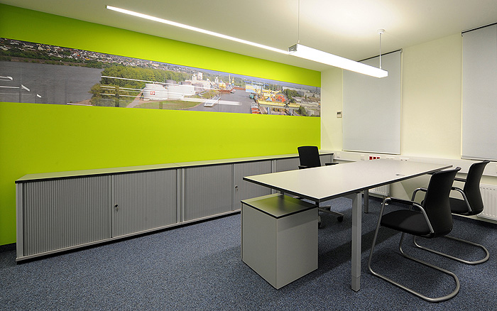 So kann man sagen, dass das Gesamtprojekt aus einem Guss entstanden ist, ein Idealfall! Von Empfang, Wartezone, Produktpräsentation, mit Integrieren des hauseigenen Rohstoffes Bims als Gestaltungsmittel und Akustikmaßnahme, über Kaffeetheke, Konferenzraum mit Eigenentwurf des Konferenztisches und Multimediaeinbauwand, bis zum Chefbüro, zieht sich eine zeitlos, klassisch Linie durch, das Gebäude, lichtdurchflutete, freundliche Räume, mit der Verkörperung von Bodenständigkeit und Langlebigkeit, passend zum Produkt und Bauherrenwunsch.